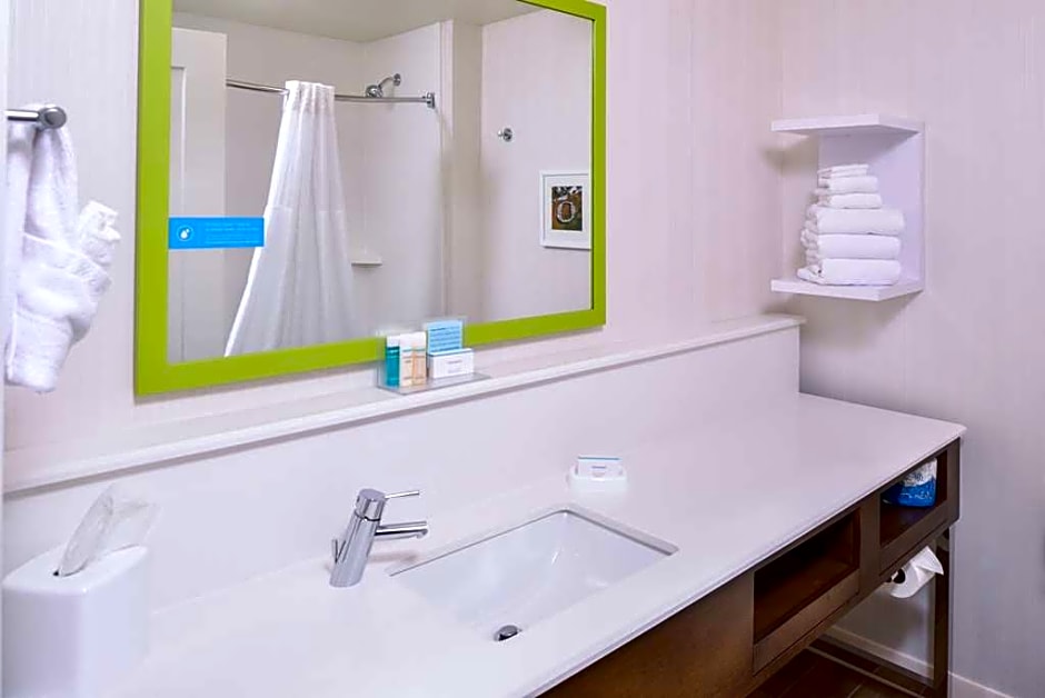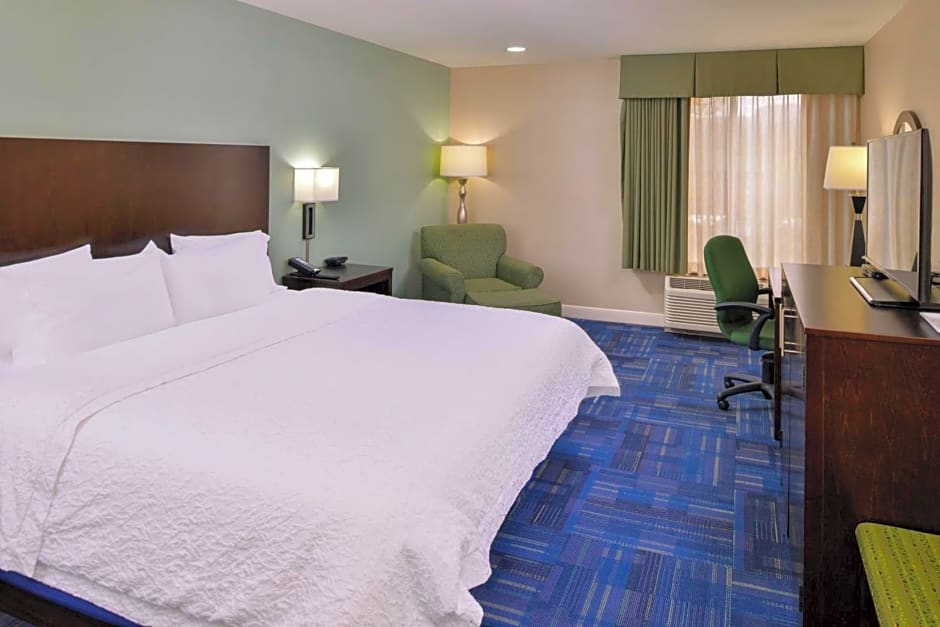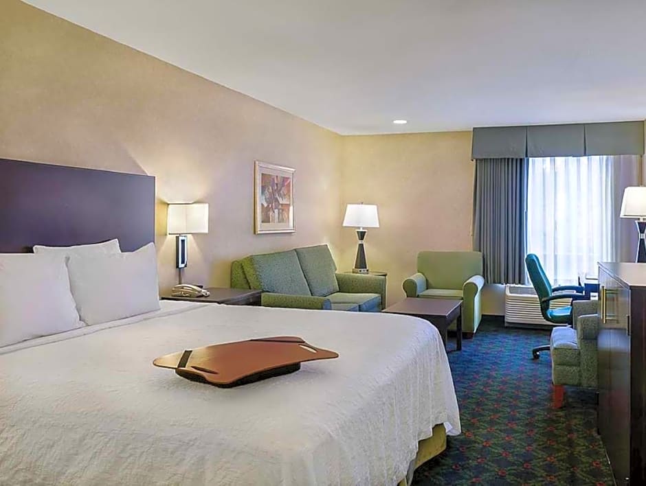 Any corresponding photo may not reflect the specific accessible room type or room feature. This hearing accessible, non-smoking room features one king sized bed. The room also has a visual alarm and notification devices for the doorbell or door knock and incoming phone calls. The room features our luxurious clean and fresh Hampton bed, comfortable soft seating, microwave, refrigerator, a HDTV, and easy to operate alarm clock/radio. In the bathroom, you'll enjoy a WaterPik shower head and curved shower rod. The free high-speed & Wireless internet access will help you stay connected while on the road. If you prefer not to work at the desk, you can use the convenient lapdesk instead. You'll also enjoy the convenience of having a coffee maker with tea service and iron/ironing board in your room.